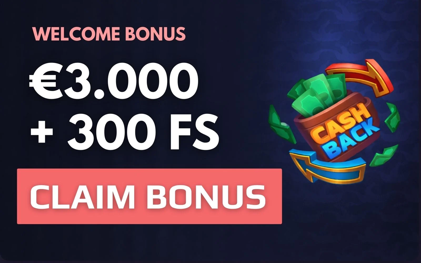 Novos jogadores podem ativar um first deposit bonus até €3.000 + 300 Free Spins, válido após o primeiro depósito.